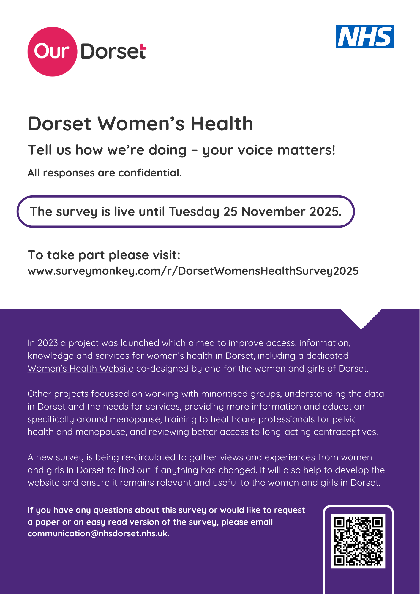 Take part using the following link: https://www.surveymonkey.com/r/DorsetWomensHealthSurvey2025