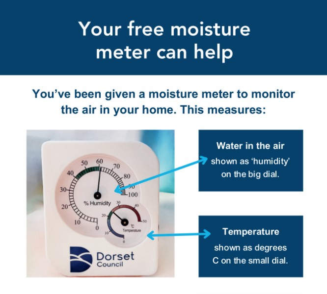 Anna Beech, from Dorset Council and health literacy champion has created these public-facing leaflets for damp and mould intervention with health literacy in mind. Anna’s department received moisture meters, which measure humidity in the home, to distribute. These leaflets were created to show the impact of damp and mould and how to use the moisture meter.
