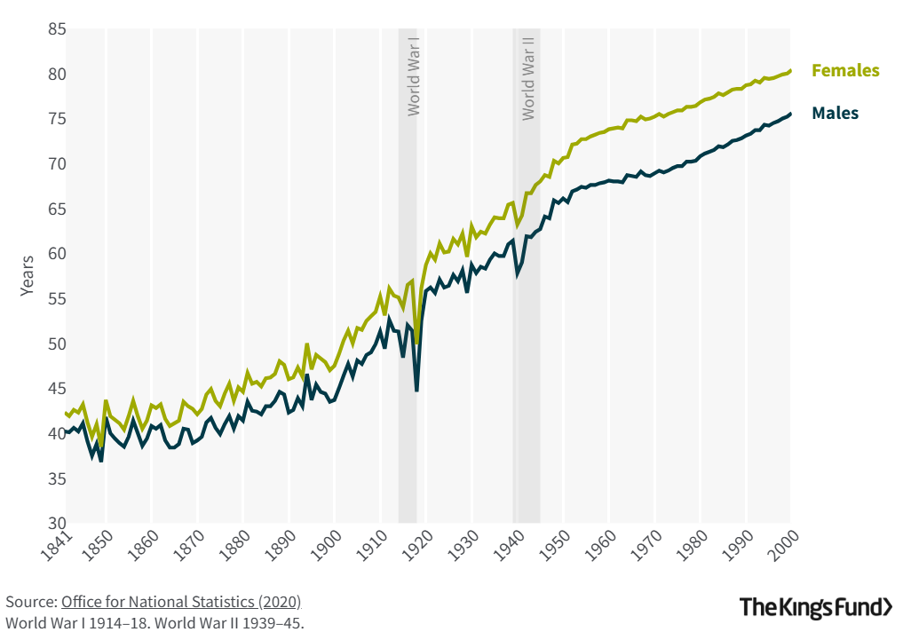 Mortality in England and Wales has declined since the 19th century, leading to a long-term rise in life expectancy (see Figure 1). Males born in 1841 could expect to live to only 40.2 years and females to 42.3 years, mainly because of high mortality rates in infancy and childhood. Improvements in nutrition, hygiene, housing, sanitation, control of infectious diseases and other public health measures reduced mortality rates, increasing life expectancy to 56 years for males and 59 years for females by 1920.