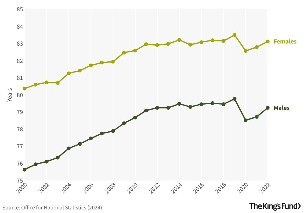 For the three aggregated years 2020–22, although male life expectancy was 78.8 years, average healthy male life expectancy was only 62.4 years – ie, 16.4 of those years (21%) would have been spent in poor health. Female life expectancy was 82.8 years, of which 20.1 years (24%) would have been spent in poor health. Although females live an average of four years longer than males, they spend a higher proportion and more years of their lives in poor health.