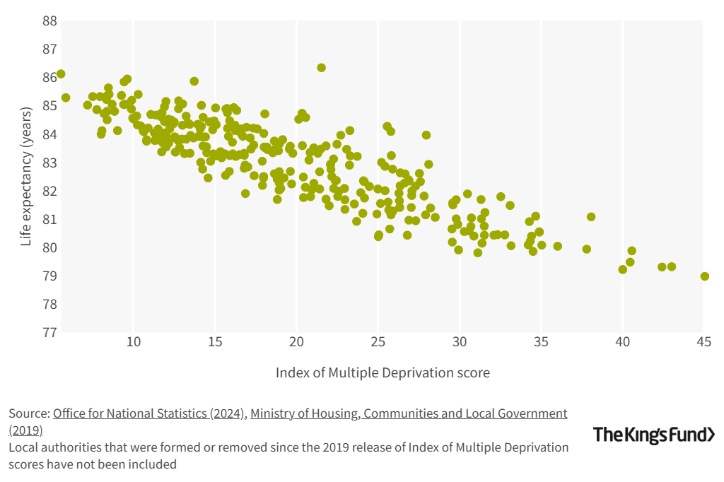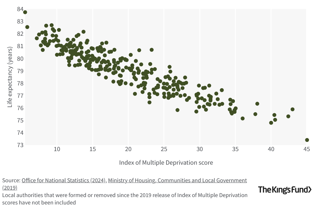 Life expectancy in England is significantly lower for people living in more deprived areas than for people living in less deprived areas (see figures 3 and 4). Socio-economic inequalities in health in England have been widening since 2010.