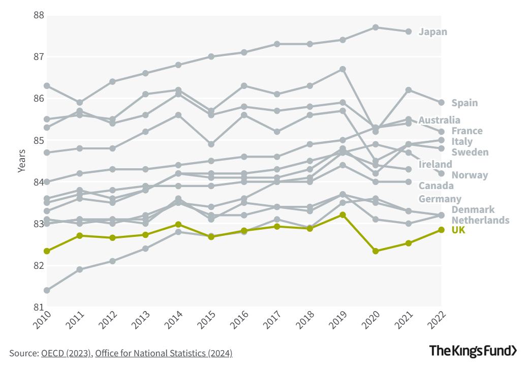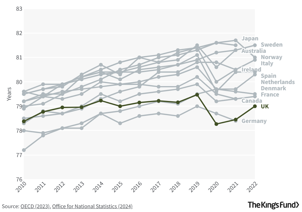 Life expectancy in the UK compared poorly with most comparator countries before the Covid-19 pandemic; higher excess mortality during the pandemic has resulted in the UK’s further downward slide in international life expectancy tables, with female life expectancy now the lowest among comparator countries (with the exception of the US). Meaningful long-term gains in reducing health inequalities and improving population health and the UK’s life expectancy relative to comparator countries have never been more urgent and yet also more challenging.
