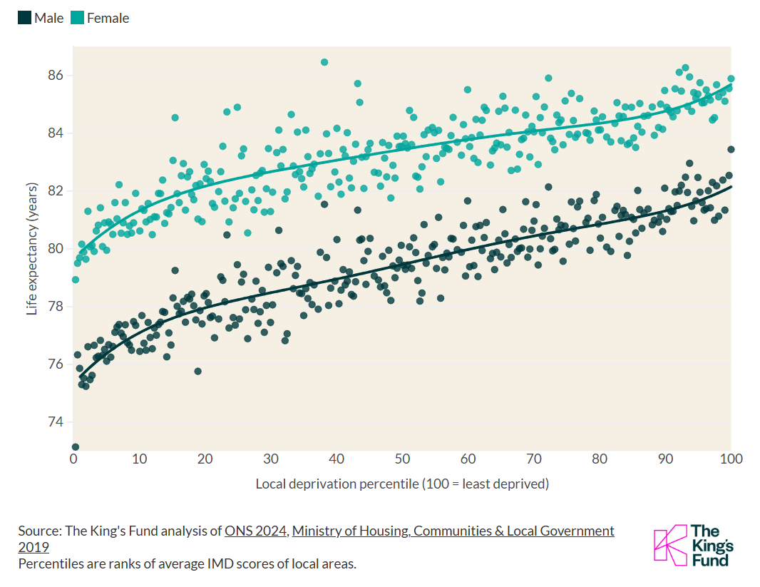 This social gradient relationship holds true across the whole population – health inequalities are experienced by everyone, not just between those at the very bottom and top. Figure 1 shows how during 2021–2023 in England local deprivation was linked to life expectancy.
