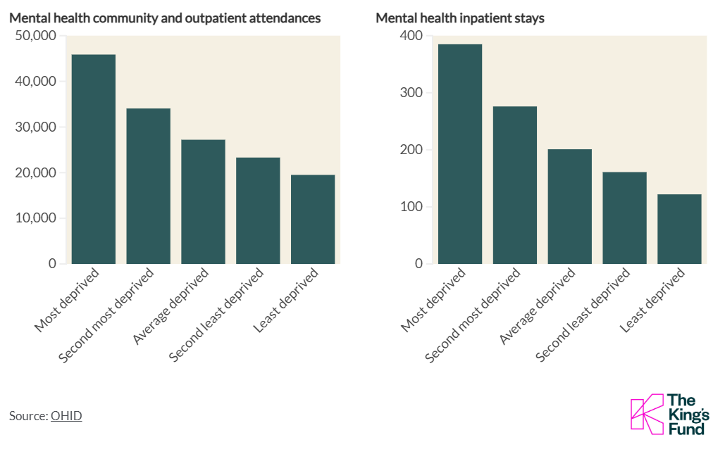 First, data suggests that demand for mental health services is higher among more deprived communities. Figure 2 shows that in England in 2019/20, both the rate of attended contacts with community and outpatient mental health services and the rate of inpatient stays in secondary mental health services were higher among more deprived populations.