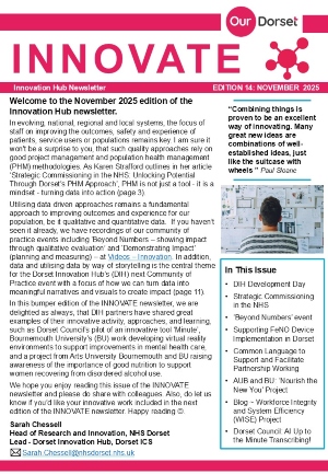 The Dorset Innovation Hub newsletters are published four times per year. They are designed to be of interest to everyone working in health and social care within Dorset, and an accessible way of finding out about the latest news on innovation across Dorset and the help that is available to innovators. If you would like to join our mailing list to receive these newsletters, please email dorsetinnovationhub@nhsdorset.nhs.uk.