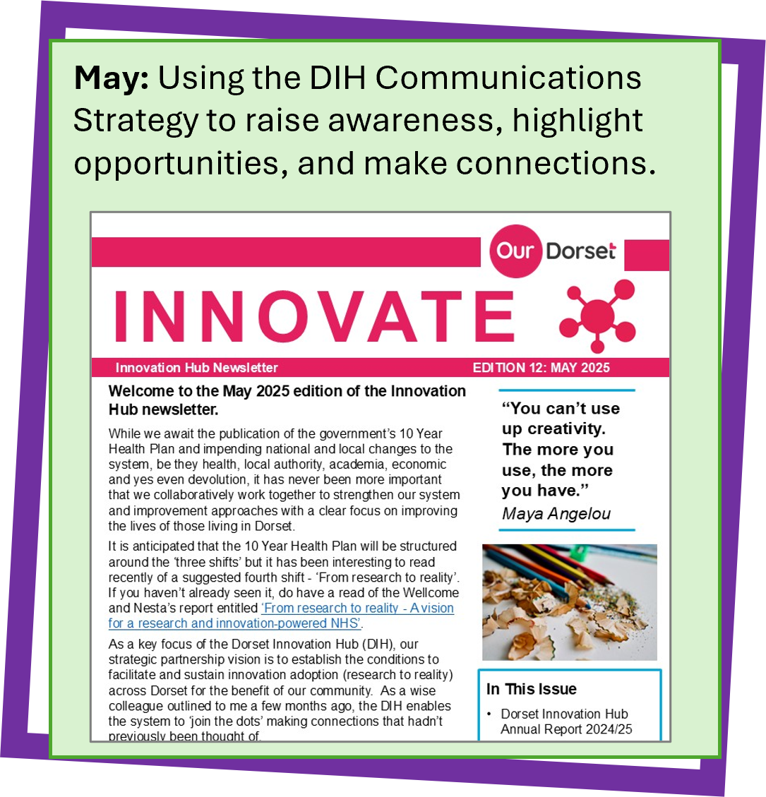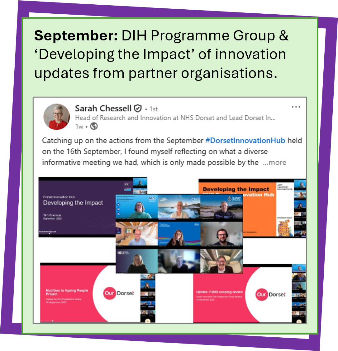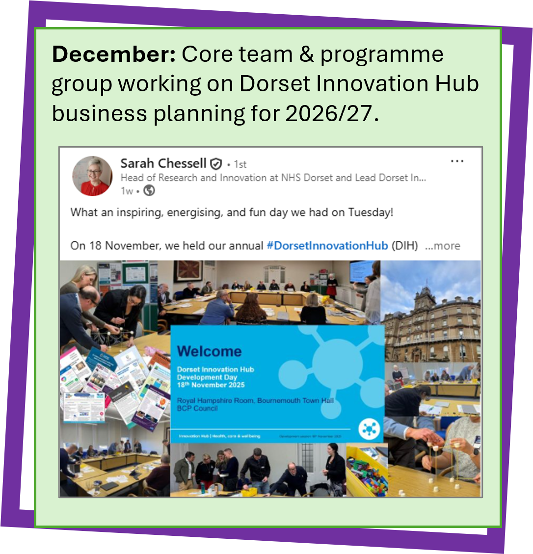 As we welcome the start of 2026, we pause to reflect on what we’ve achieved through the strategic system partnership work of the Dorset Innovation Hub. As you will see, we believe through learning together with a collaborative people centred approach we are creating an innovative system culture that can help to make Dorset the healthiest place to live. There have been so many great moments over the year, so we hope you enjoy our selection of 2025 ‘at a glance’.