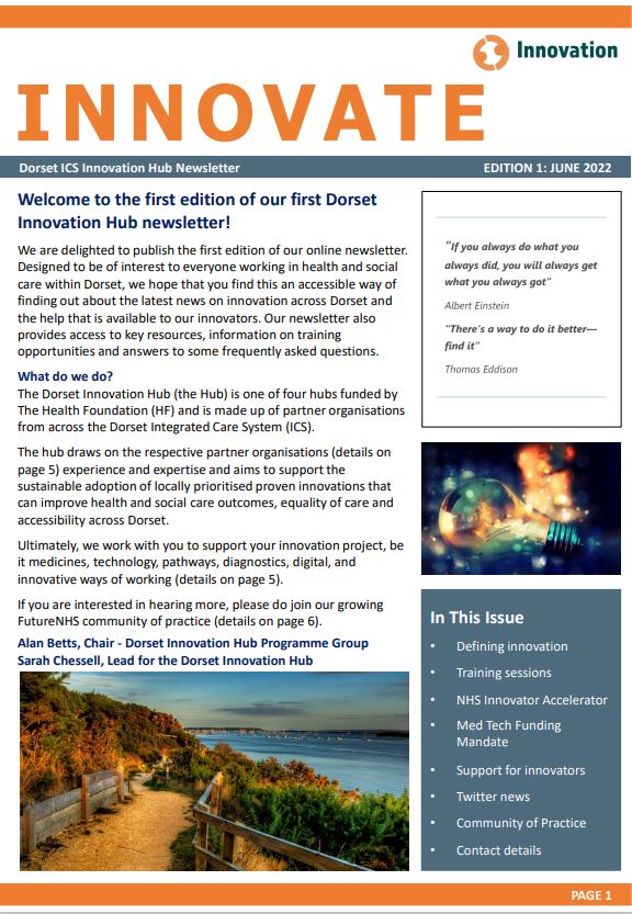 The Dorset Innovation Hub newsletters are published four times per year. They are designed to be of interest to everyone working in health and social care within Dorset, and an accessible way of finding out about the latest news on innovation across Dorset and the help that is available to innovators. If you would like to join our mailing list to receive these newsletters, please email dorsetinnovationhub@nhsdorset.nhs.uk.