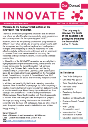 The Dorset Innovation Hub newsletters are published four times per year. They are designed to be of interest to everyone working in health and social care within Dorset, and an accessible way of finding out about the latest news on innovation across Dorset and the help that is available to innovators. If you would like to join our mailing list to receive these newsletters, please email dorsetinnovationhub@nhsdorset.nhs.uk.